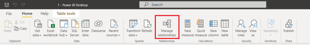 Let’s begin by manually linking two of our tables: our ‘Items’ database, which contains all information about our products, and our ‘Transactions’ table, which has all of our sales transactional data. There are two methods to start a relationship: To begin, pick ‘Manage Relationships’ from the ‘Home’ menu.