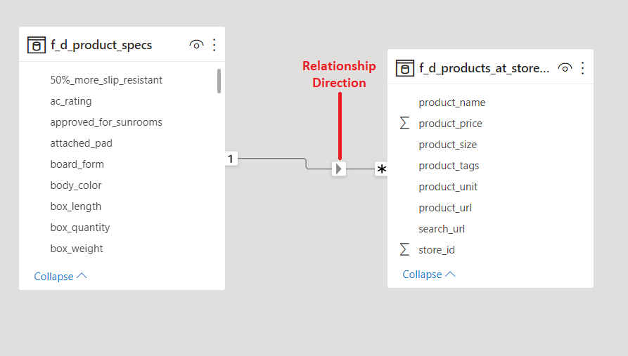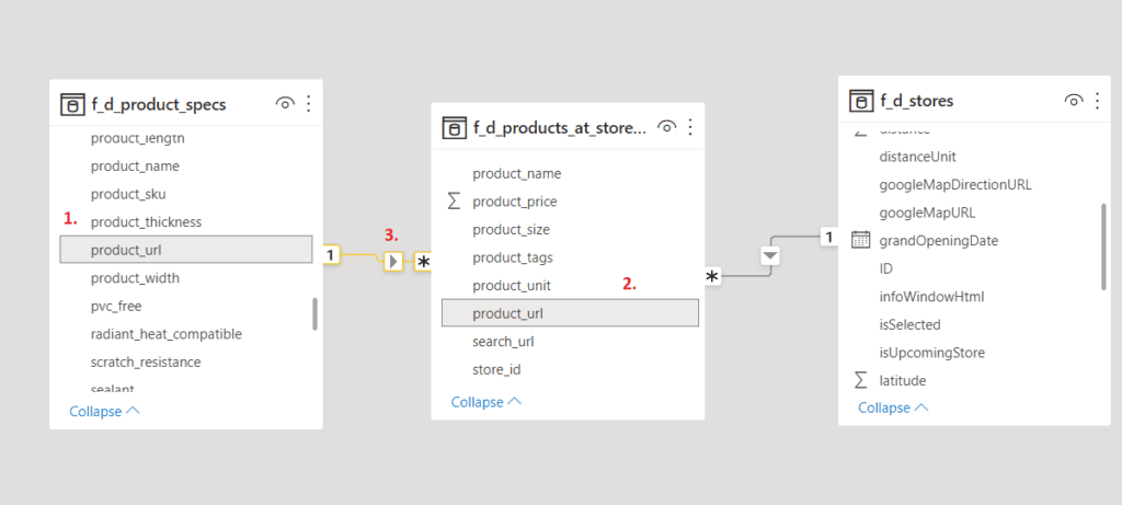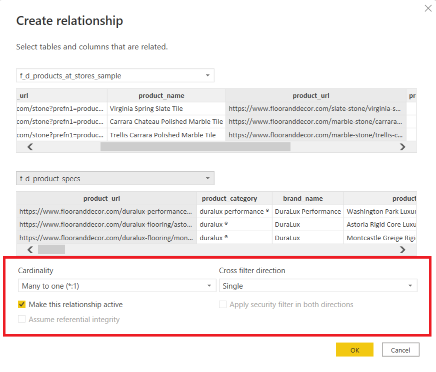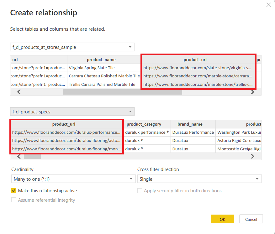 Choose the two tables you wish to link with a relationship, as well as the columns (fields) that will connect them. You’ll note that Power BI attempts to determine the columns that will link your tables automatically. When your tables are properly configured, Power BI will generally get this correctly. The figure below shows that Power BI recognized the ‘product_url’ column as the field via which we would construct our link. This is the column that we want to utilize. Just keep in mind that column names do not have to be the same in order to join tables.