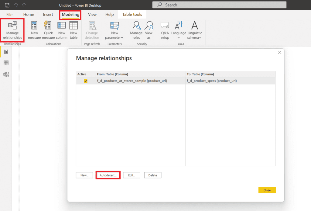 When you query two or more tables at the same time, Power BI Desktop tries to identify and build connections for you. Cardinality, Cross filter direction and Make this relationship active are all configured automatically. Power BI Desktop searches the column names in the tables you’re querying for possible associations. If there are any, such associations are immediately formed. If Power BI Desktop cannot identify a match with high confidence, it does not construct the connection. However, the Manage connections dialogue box may still be used to manually establish or change relationships. On the Modeling tab, select Manage relationships > Autodetect.