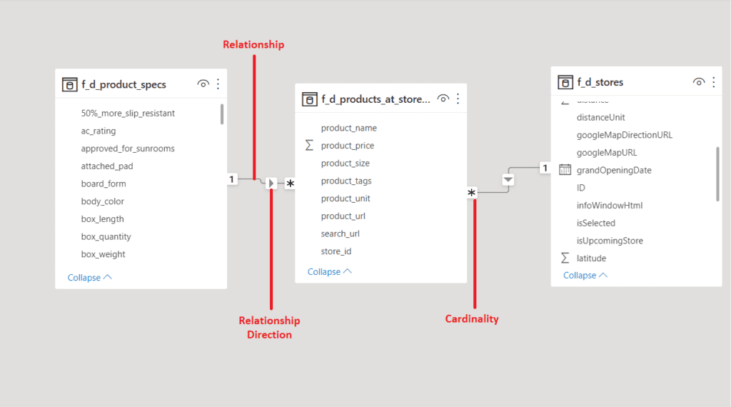 Let’s start from the beginning and utilize the preceding example to construct a connection between our ‘f_d_product_specs’ and ‘f_d_products_at_stores_sample’ tables so that the tables are linked through relationships by choosing ‘Managing Relationships’. Let’s go with ‘New’.