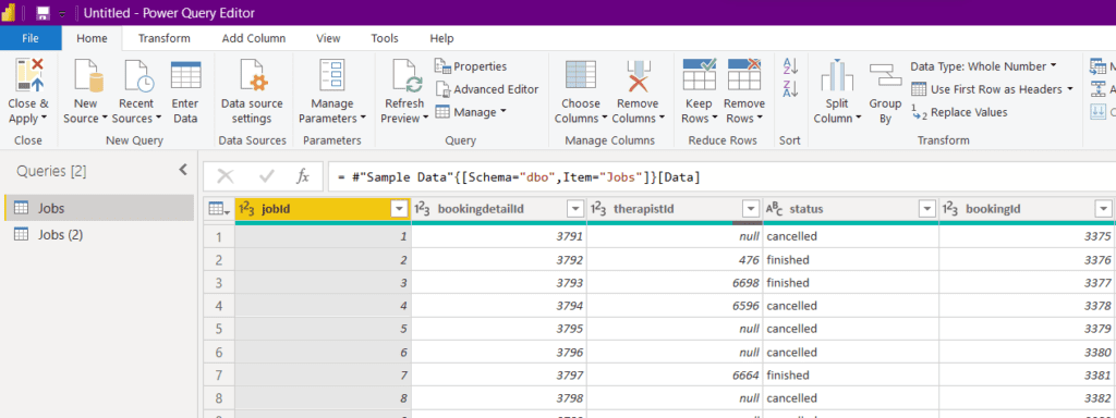 6. The chosen table will now be imported, therefore the next step is to go to the Advanced Editor on the Query Editor’s ribbon, making sure to pick the table we just imported from the database as seen below.