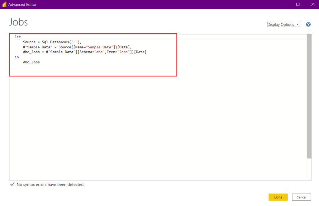 With the help of some simple M language script, we will modify the data source. Because Power BI data integration source settings do not provide us the opportunity to alter the source directly, as seen below, we must do this using M language.