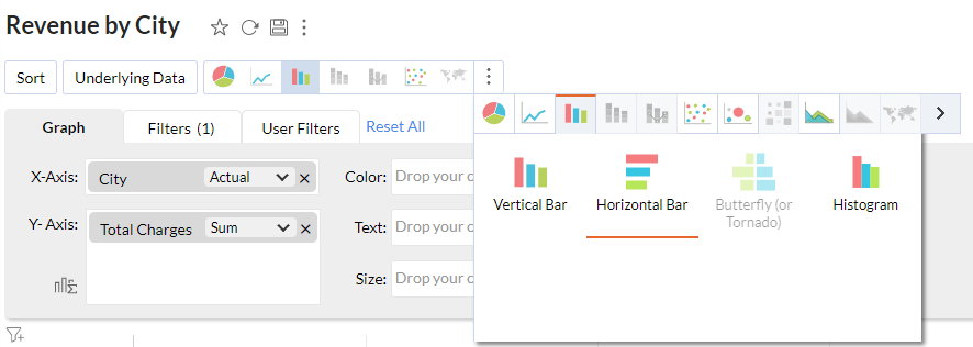 Filter Particularly used in chart view are 2 types, filter and user filter. The filter is used to apply default criteria on the chart by the developer on the other hand User filter as the name suggests provides an option for the user to choose criteria.