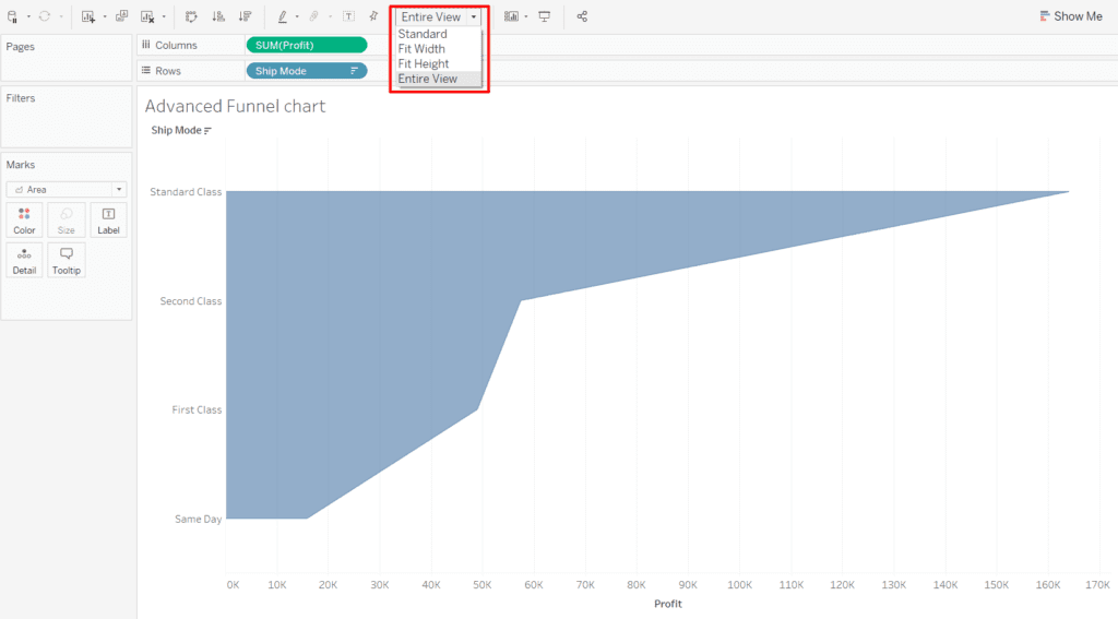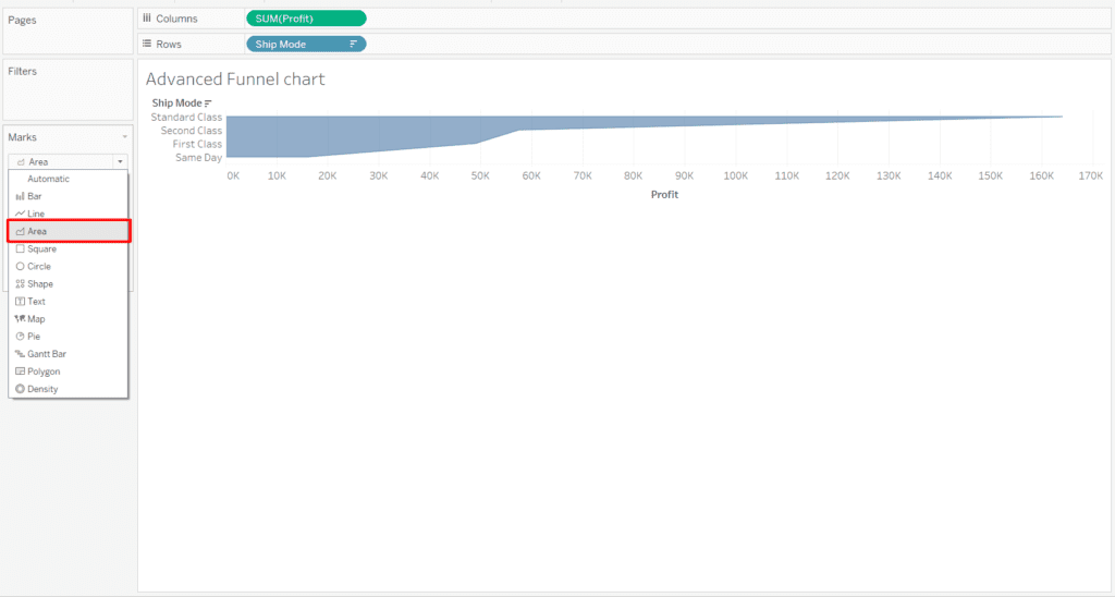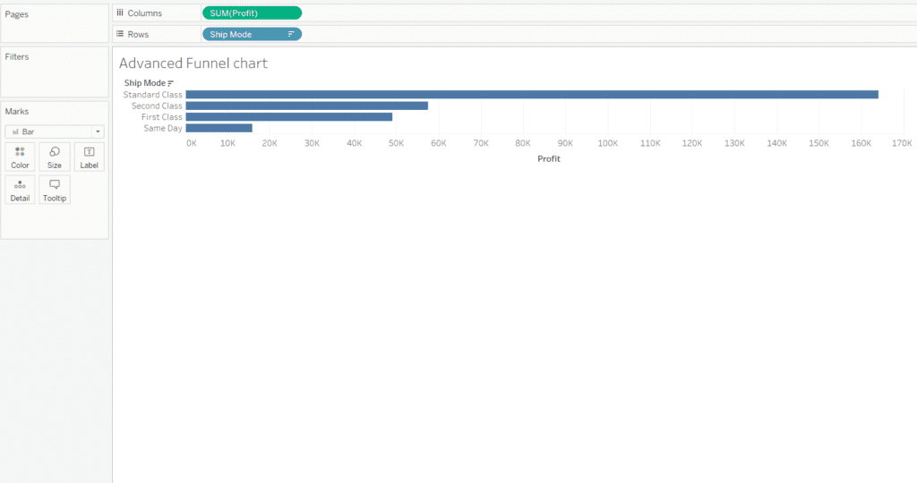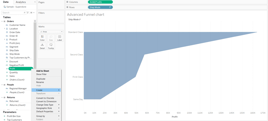 For example: –Create a Funnel chart where we can see using which ship mode we had the maximum profits. For data sources use the Sample superstore dataset.