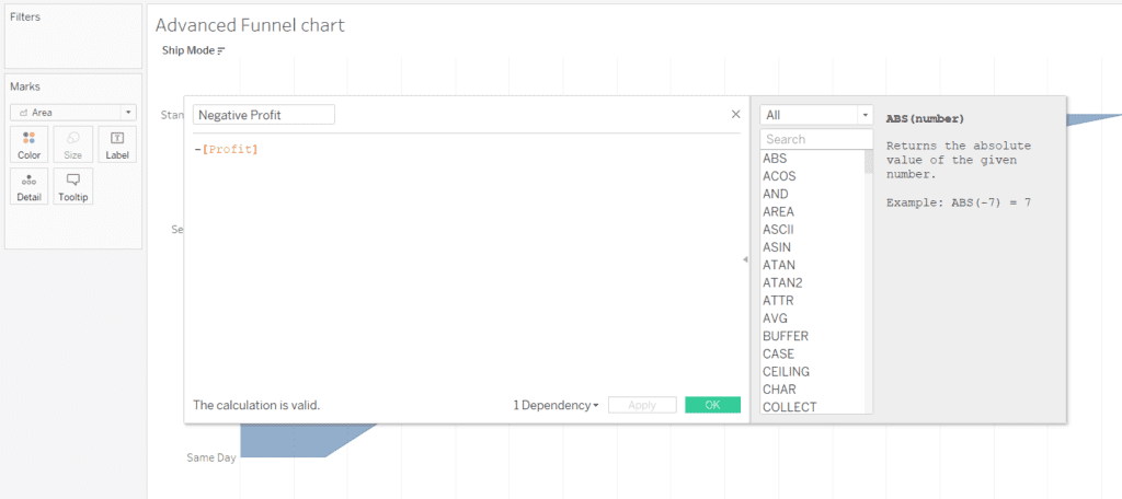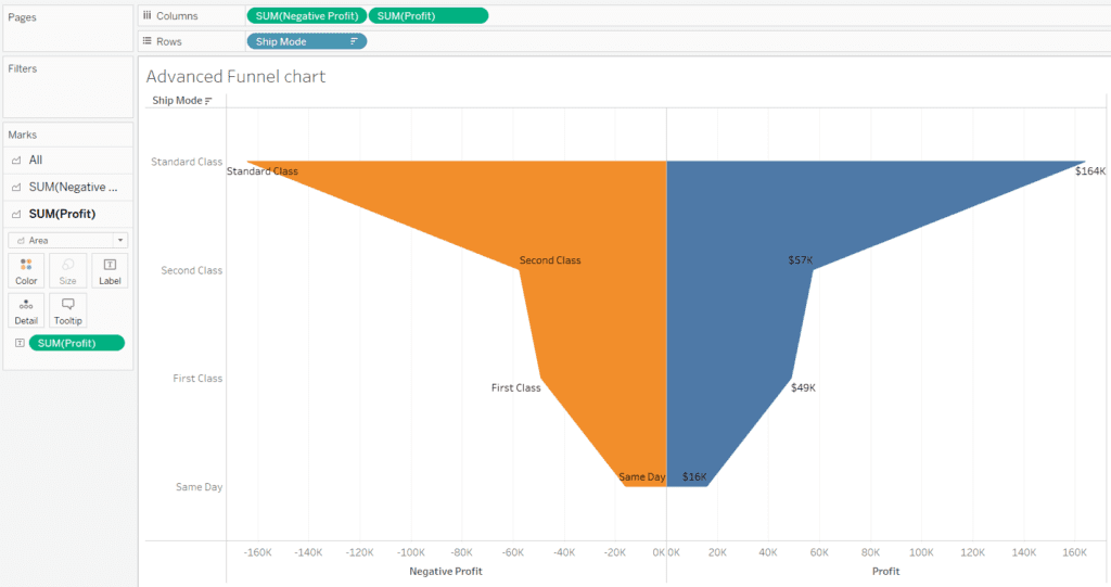 - Now we have the funnel chart but we need to finalize the funnel chart. We can change the colors of the negative and positive part distinctively to show the values. Add the “Ship mode” dimension on the text on the Negative mark panel and add the SUM(Profit) on the positive profit mark panel of the Mark card on left.