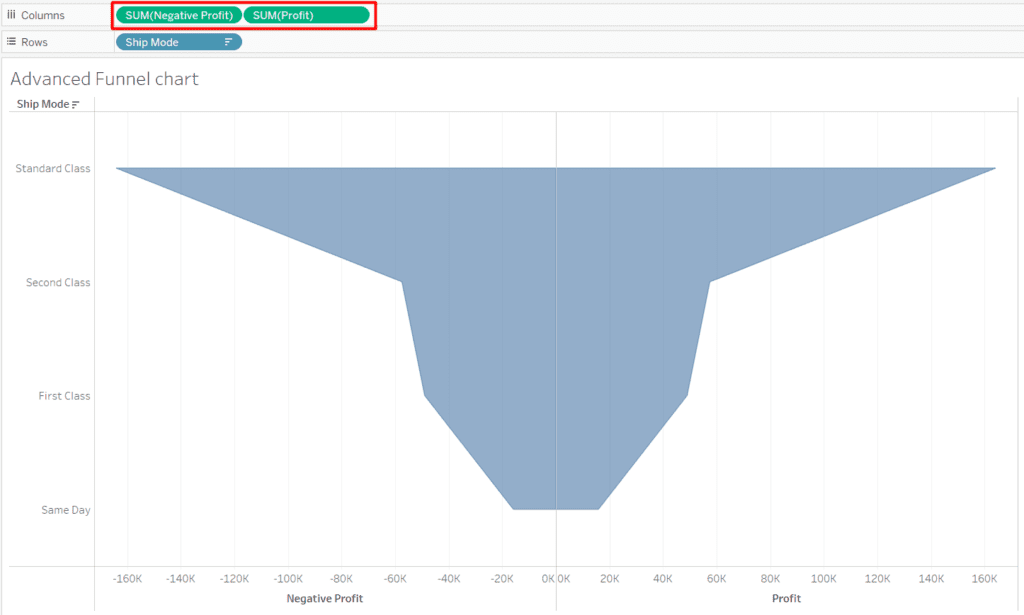 - Add this ‘Negative Profit’ calculation next to the SUM(Profit) in columns. This will show a funnel-like shape in the sheet.