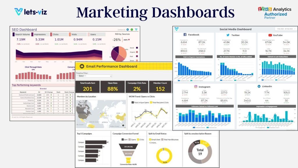 A Marketing Dashboard tracks campaign performance, ROI, and lead generation effectiveness, helping optimize marketing strategies. This dashboard integrates data from Google Ads, social media platforms, and email campaigns, showcasing insights through funnel visualizations and scatter plots for campaign comparisons.