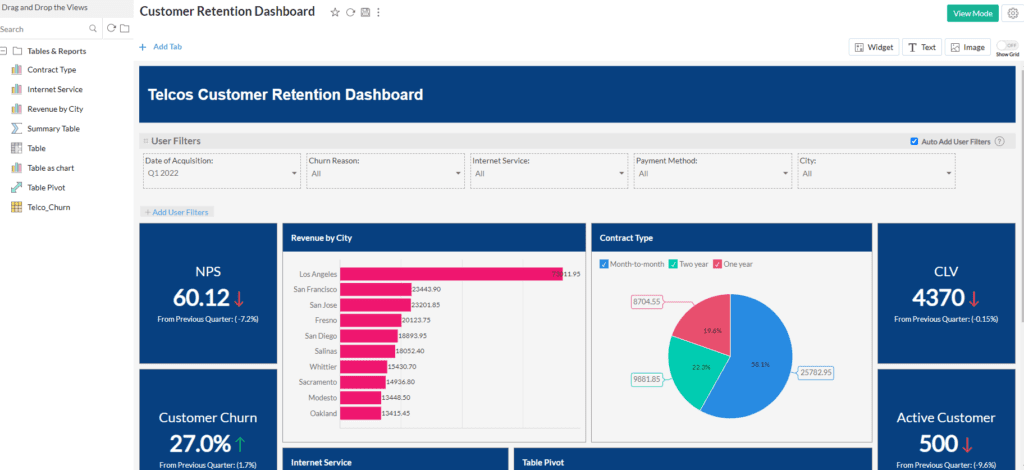A dashboard is a useful tool for consolidating reports onto one page so you can quickly see the key metrics. Zoho Analytics offers a straightforward drag-and-drop interface for quickly constructing dashboards. Note that only Managers and Server Administrators have the ability to build new dashboards. Click here to learn more about the user roles in Zoho Analytics.