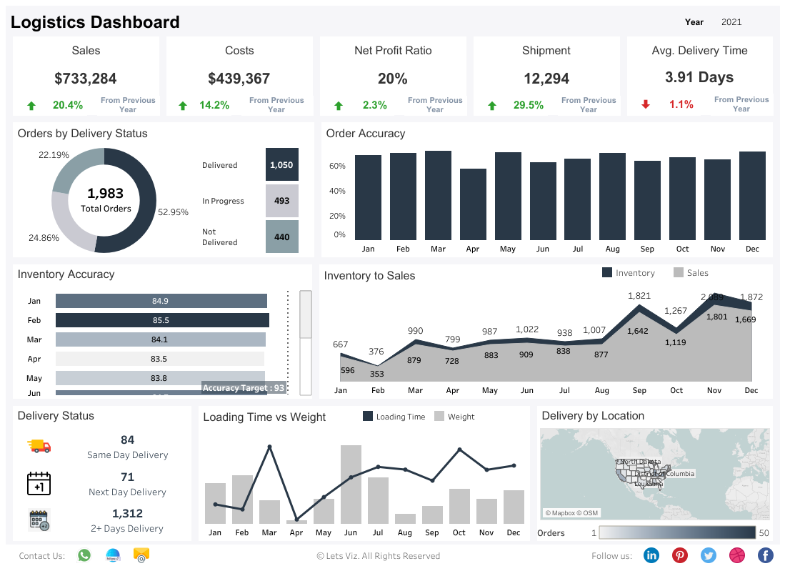 Track key logistics metrics with the Logistics Dashboard. Get real-time insights on sales, costs, net profit ratio, shipment performance, average delivery time, order accuracy, and inventory accuracy to enhance operational efficiency and decision-making