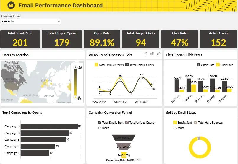 Managing multiple email campaigns simultaneously can lead to confusion if you’re relying on manual tracking methods. An email performance dashboard centralizes data from all campaigns in one place, so you can easily compare results across different timeframes, audiences, or strategies. This enables better management of resources and targeted improvements.
