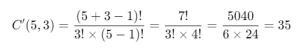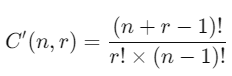 number_chosen).(n+r−1)! denotes the factorial of (n+r−1), which is the product of all positive integers up to (n+r−1).