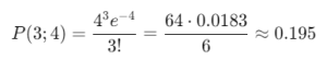 Calculate the probability of receiving exactly 3 calls in an hour when the average rate is 4 calls per hour: