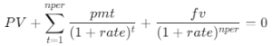 [fv] | Scalar | Optional. Future value after all payments. Defaults to 0. |
