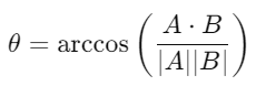 This formula computes the angle (in degrees) between two vectors using the dot product formula: